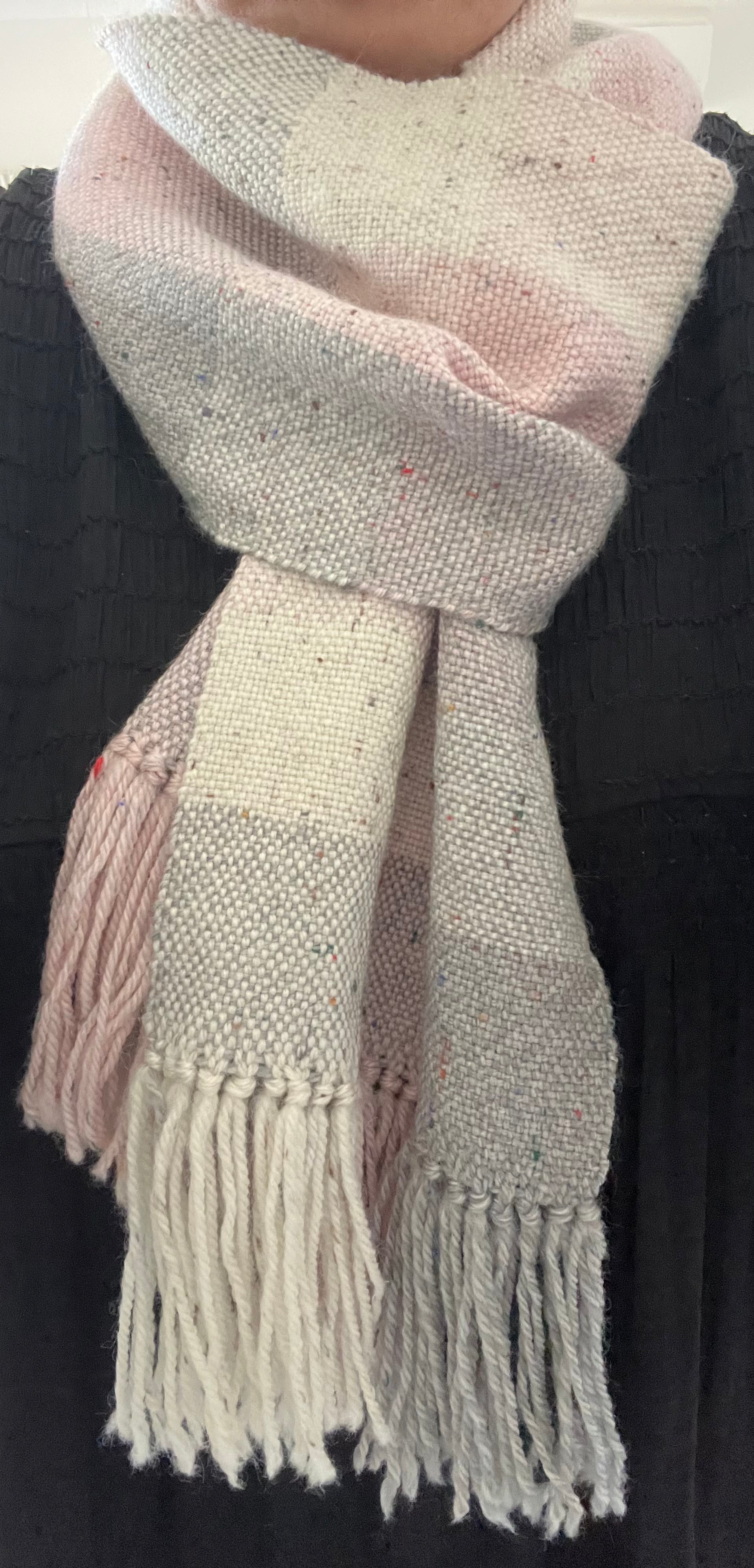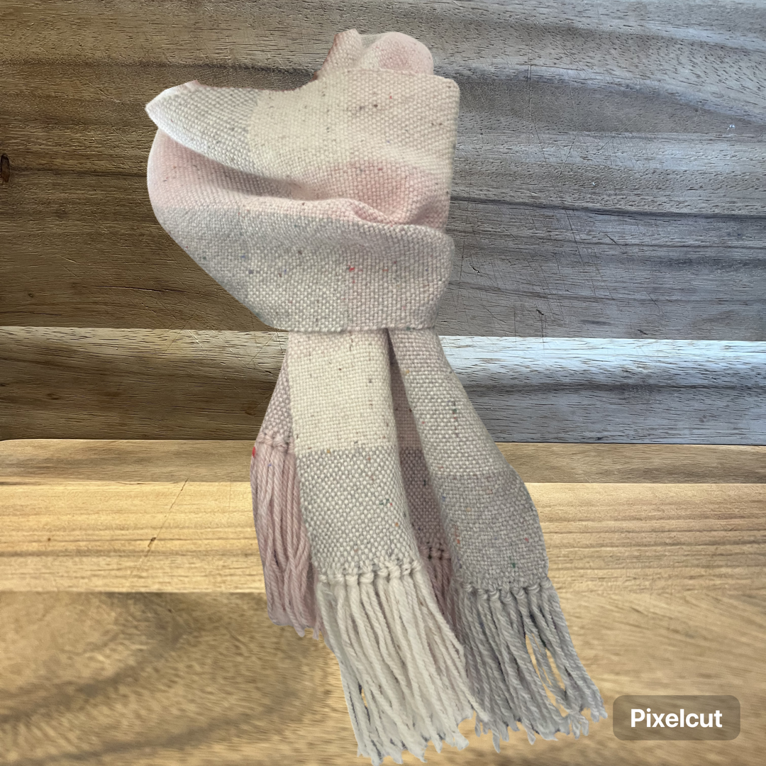 Elevate your wardrobe with this exquisite handwoven scarf in delicate shades of pink, gRey and cream. The perfect accessory for any occasion, it’s timeless design and premium quality make it a must-have.